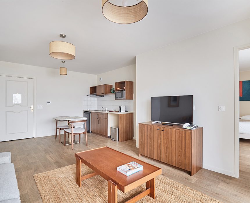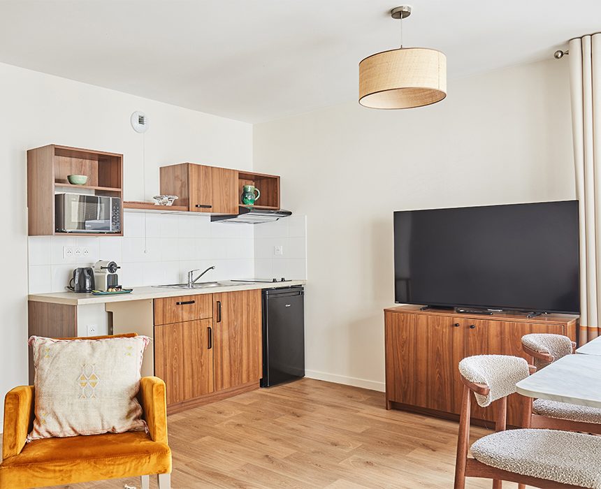 - Des cuisines équipées (réfrigérateur, plaque de cuisson, hotte, combiné four et micro-onde).